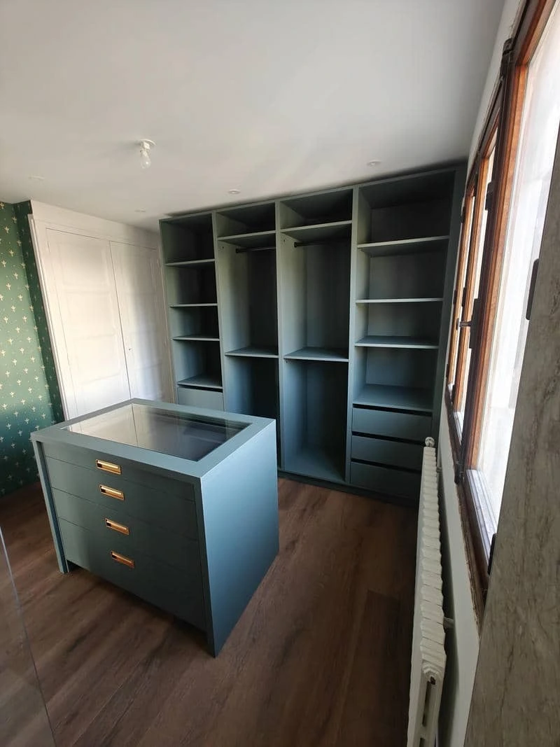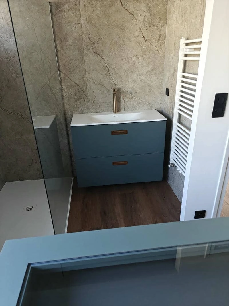 Ilot dessus vitré et meuble de salle de bain assorti.